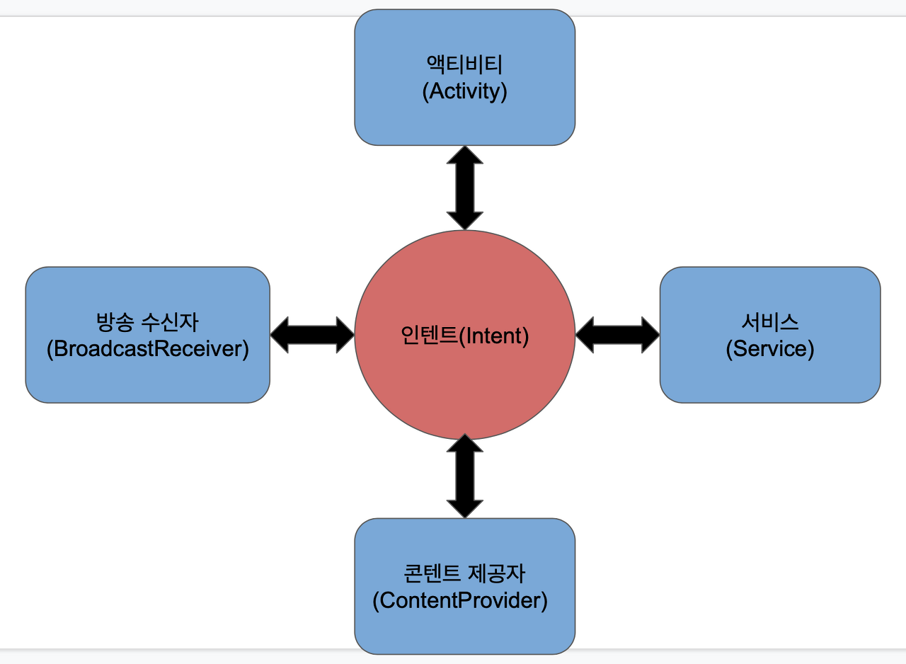 - 각 컴포넌트들은 인텐트를 통해 서로 상호작용함.