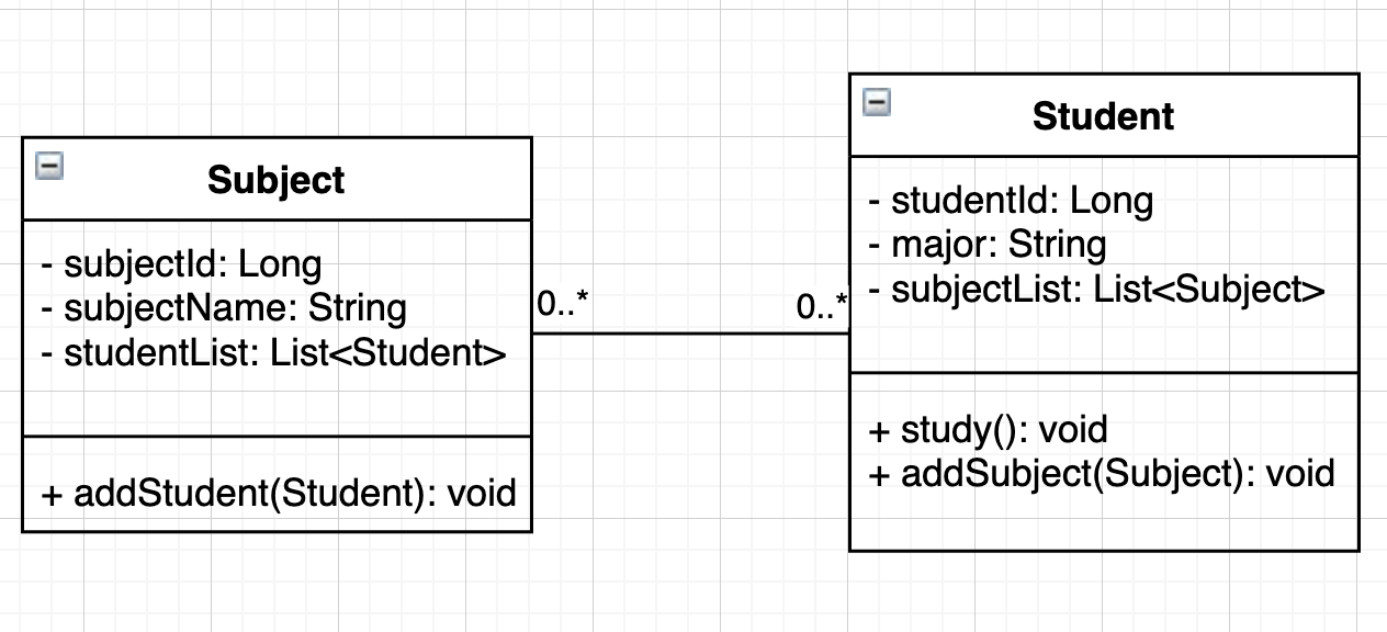 즉, 위의 다이어그램은 학생들은 여러 과목을 수강할 수 있고, 각 과목은 수강 신청한 학생들의 목록을 갖고 있도록 표현한 것이다.