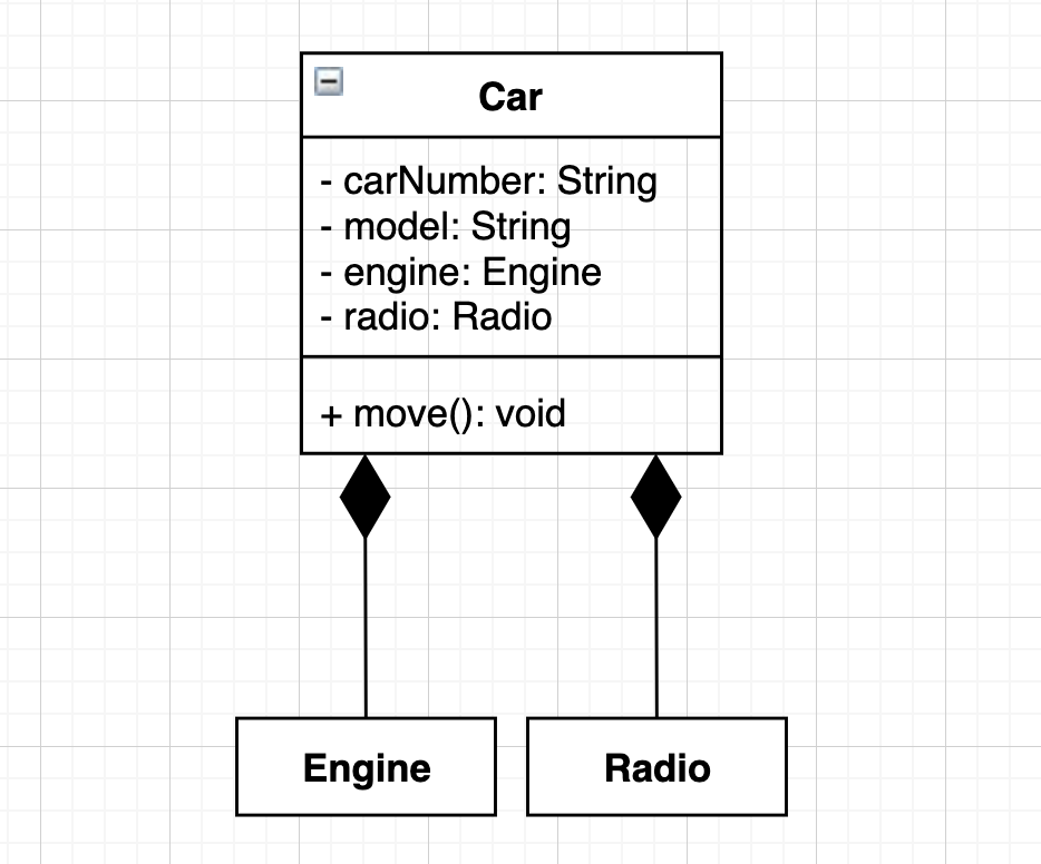 실선과 내부가 채워져 있는 마름모로 표현하며, 마찬가지로 마름모가 가르키고 있는 객체가 전체 객체이다.