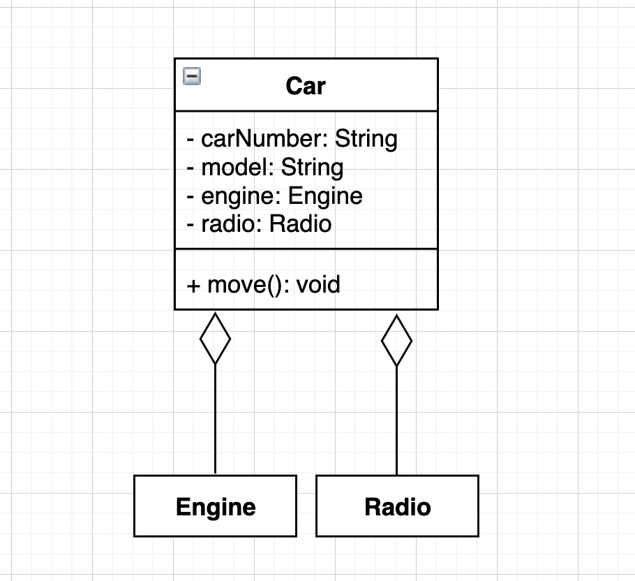 실선과 비어 있는 마름모로 표현하며, 마름모가 가르키고 있는 객체가 전체 객체이다.