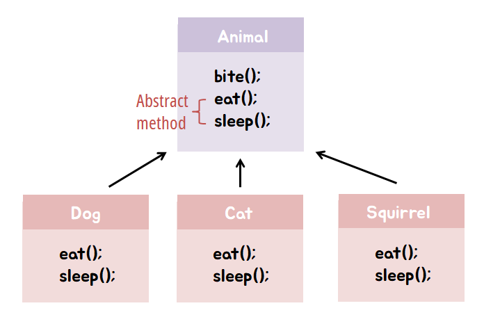 동물 클래스 인스턴스는 어떻게 울면 좋을까요? 뭔가 애매하다는 것을 느낄 수 있을텐데요. 이런 경우에 추상 메소드를 사용하면 좋습니다. 메소드의 선언은 있으되 몸체는 없는 형태로 메소드를 구현하는 것입니다.